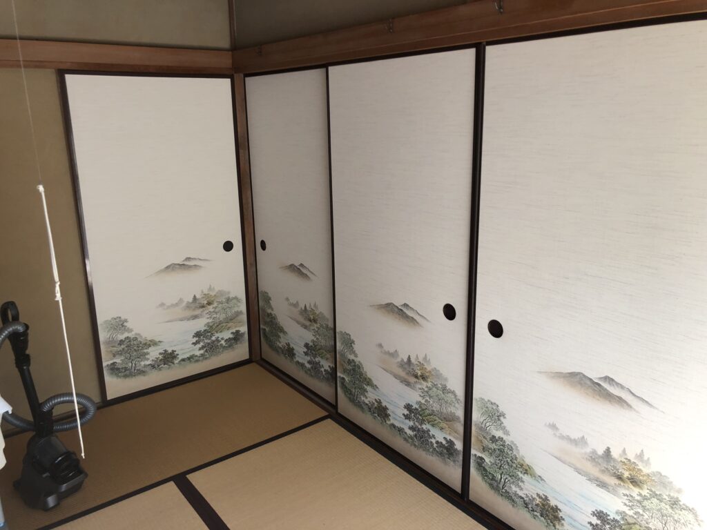 ▼山水柄の糸入りふすま紙にて、張り替えました~